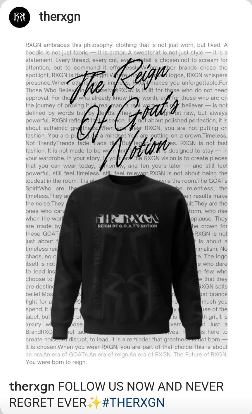 THE RXGN stands for power, presence, and progress -our fashion represents the mindset of greatness.